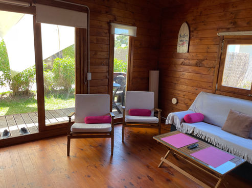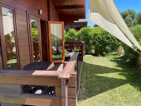 Bungalow de 2 personas de 1 dormitorio cama 1,35, con posibilidad de sofá cama para niño , salón , cocina equipada , baño y jardín . Dispone de TV , aire de pingüino , ventilar techo y portátil . Parking y piscina compartida ( 3 bungalow )